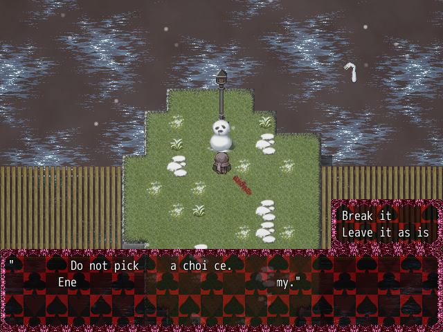 There are various snowmen you can find throughout the game and some have creepy messages (like the one at Bandersnatch’s place), and some have useful hints (like the one at the Carroll River telling you not to pick “Girl, Daughter, Sister Mother”, addressing them as enemies. This is a reference to the prologue of the game, and a hint of how to access the Endings F and G). Both of these interactions happen if you have 0 SEN.