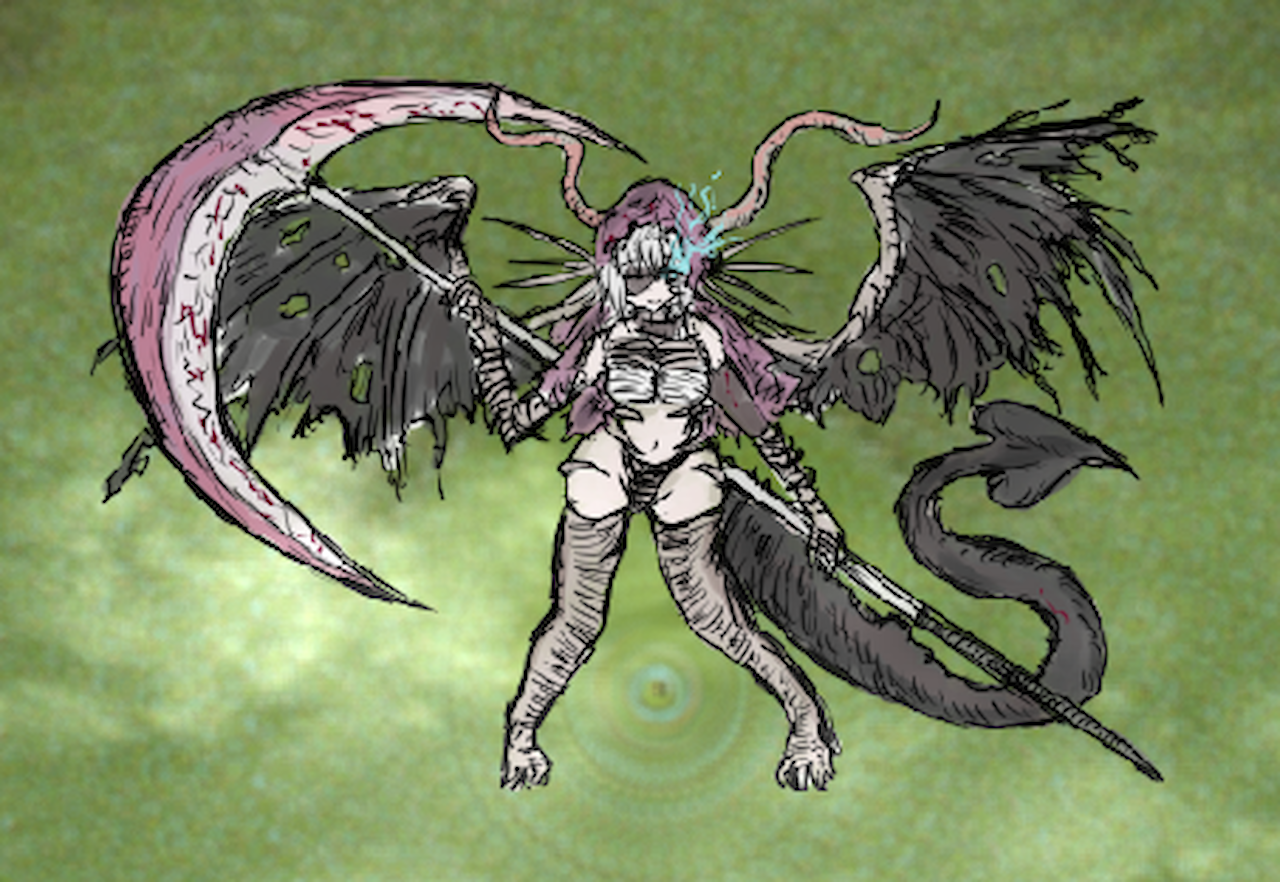 She’s a headless demon-like being without an arm and a head. In the other hand she’s holding a scythe, she has demonic wings, and a giant tail, which makes her look intimidating.