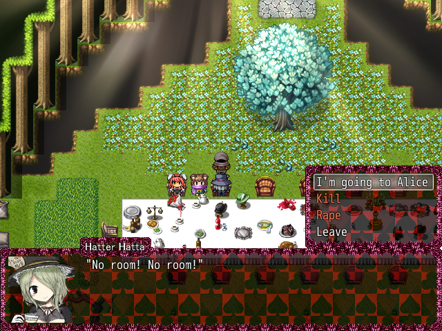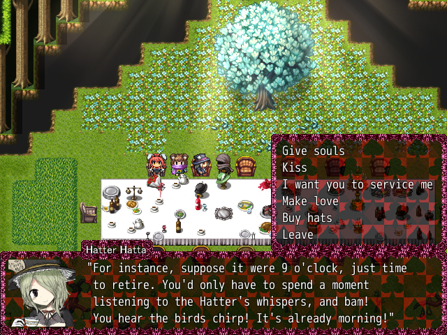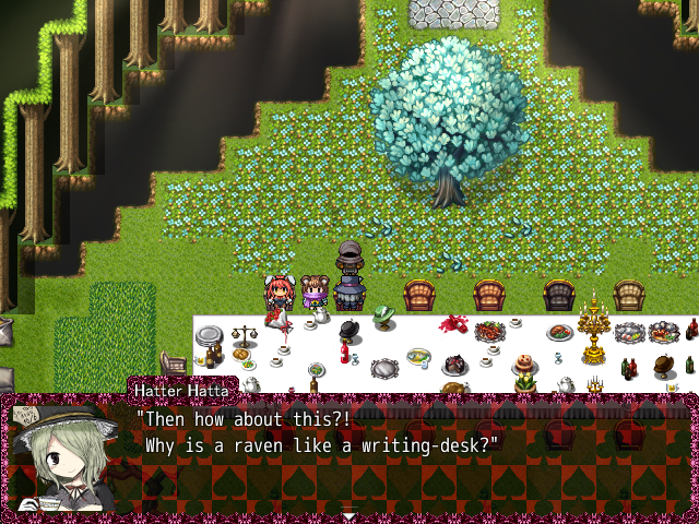 If you talk to Hatta again, she’ll ask you if you’re going further, stating that she won’t stop you. However, she’ll proclaim that she’s a “gossip girl!”. Haigha will then intervene and tell her that she can’t do that because Jubjub told all of them to not let anyone pass. But Hatta will protest by saying a bunch of stuff against her, calling her a “desperate bird, since it lives in perpetual passion”.