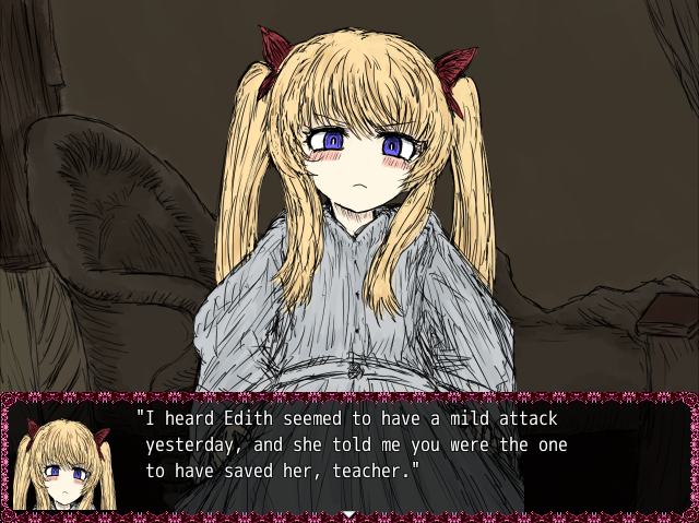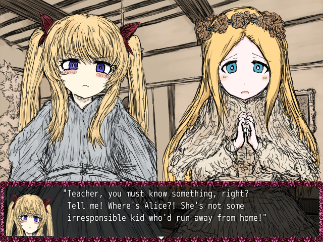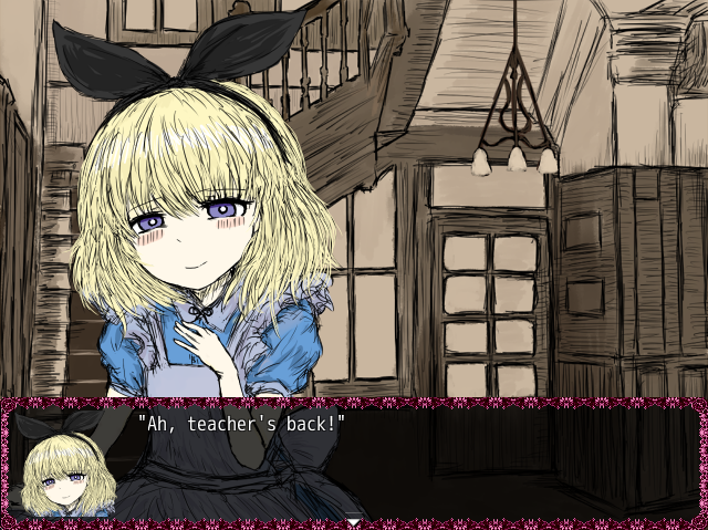 The visual novel part starts with Lewis Carroll talking to Mr. Robinson, they will be talking about Alice, and then the scene will continue with a view of the residence area where the three sisters are, and where you will be spending time with them.