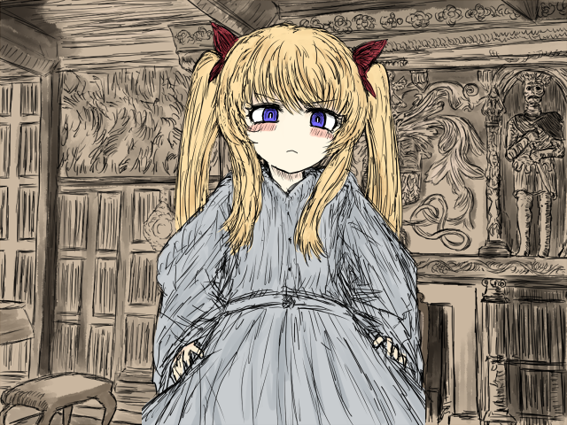 Lorina is quite petite. She has a little bit darker blue eyes and long blonde hair. She has the twin-tail hairstyle – her hair is held by two red ribbons. Her clothing is plain and simple, it just being a greyish light blue dress of some sort. Lorina’s facial expressions are stern – she often looks displeased.