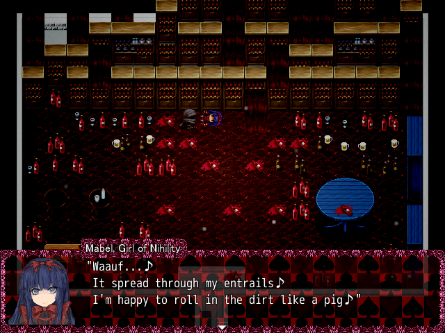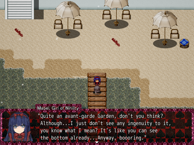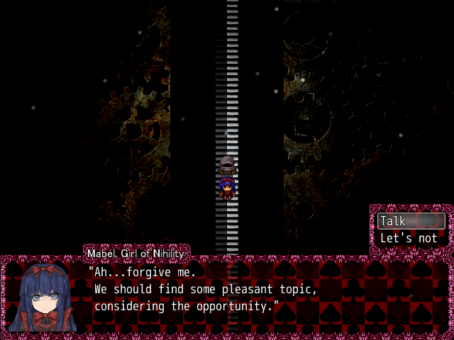 If you talk more to Mabel she will start rambling on how she’s the “oldestest” around, and how everyone keeps bullying her by calling her a fossil and a relic of the past. She will say how she’s poor because her only role is to prop “Alice up-up!”, and that because of that is why Alice gets to shine and be a heroine.