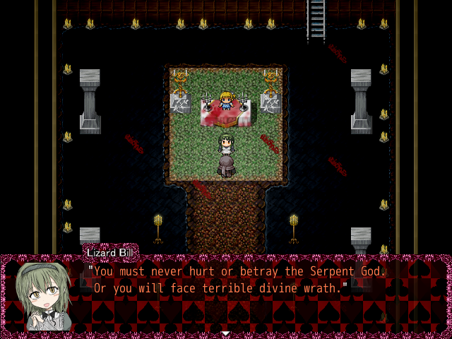 The Serpent God is a character in BLACKSOULS 2 that appears in the Ripon Grand Cathedral, at the Serpent God’s Altar area. He’s the deity that Bill dedicated his entire life to worship, and he’s also a very cute boy, just like Bill.