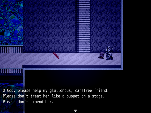 There is also a secret message hidden in the statue, but only if you inspect it while you have 0 SEN: “O God, please help my gluttonous, carefree friend. Please don’t treat her like a puppet on a stage. Please don’t expend her.”